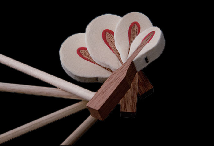 弦槌是直接叩击琴弦、使其发出声音的重要零件。横向观看K系列的弦槌,可以明显看到其内部红色的羊毛毡。由于内部植入了羊毛底毡,保证了内侧的硬度,从而更好地实现了“内刚外柔”的理想结构。